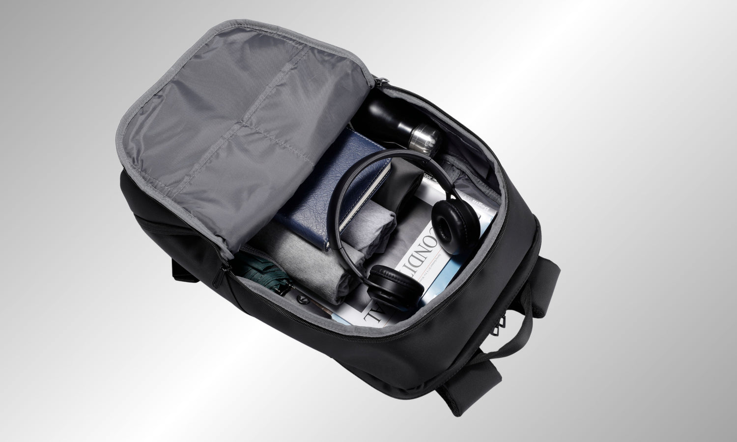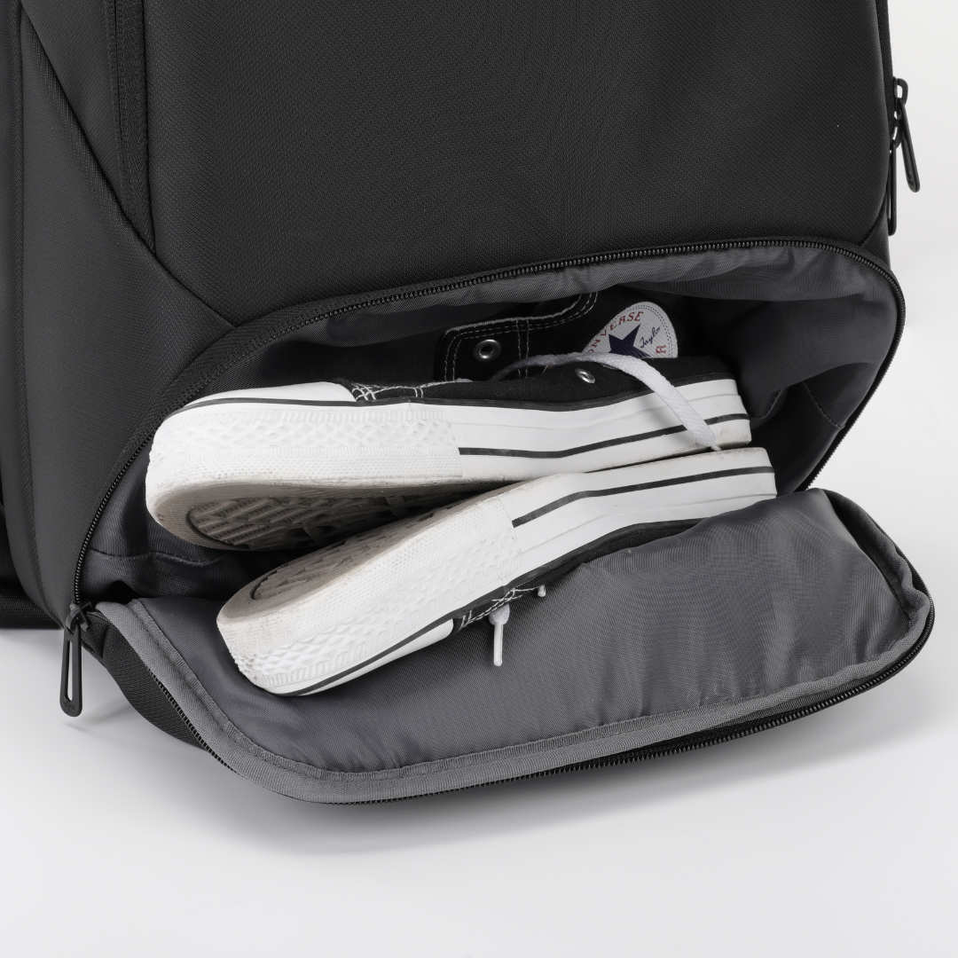 Apertura principal con capacidad de 22 L. Incluye 2 bolsillos normales, 2 con cremallera y 2 espacios para botellas. A su vez incluye espacio para Baleine - Card y Llaves.